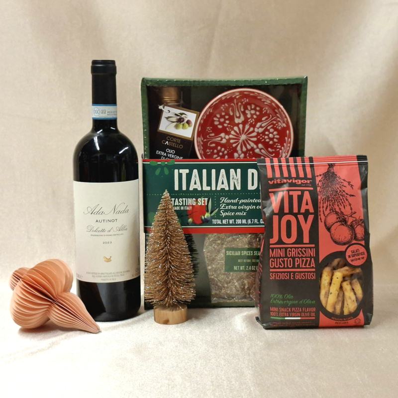 Haal de smaak en beleving van Italië in huis met het Italiaans kerstpakket Olio. Dit luxe geschenkpakket bevat hoogwaardige Italiaanse delicatessen en een verfijnde fles rode wijn. Perfect als kerstpakket, exclusief relatiegeschenk of luxe cadeau voor speciale momenten. Het pakket wordt standaard geleverd in een elegante geschenkdoos.